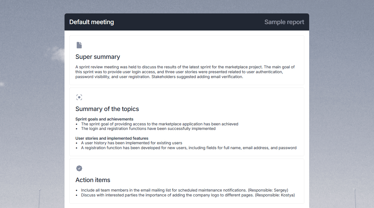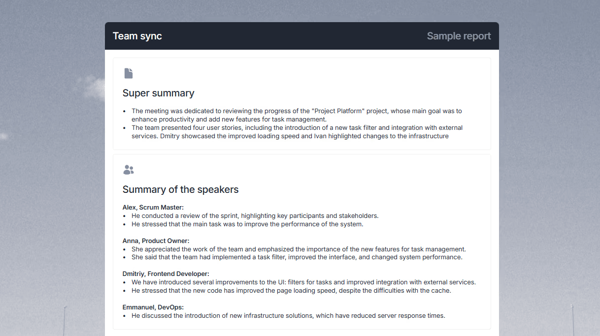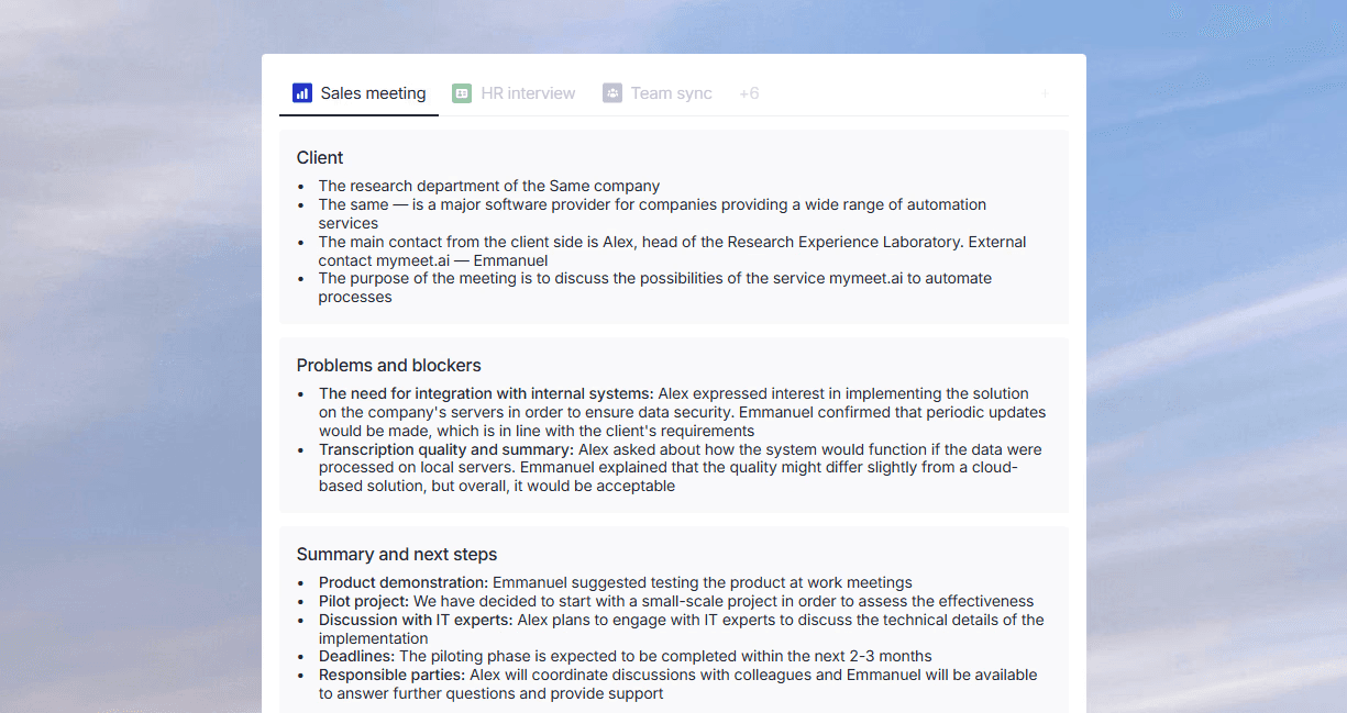 Implementing mymeet.ai changed the process. After each meeting where he delegated tasks, he received a summary with clear documentation — who, what, by when, with what result criteria. The system reminded me about checkpoints.