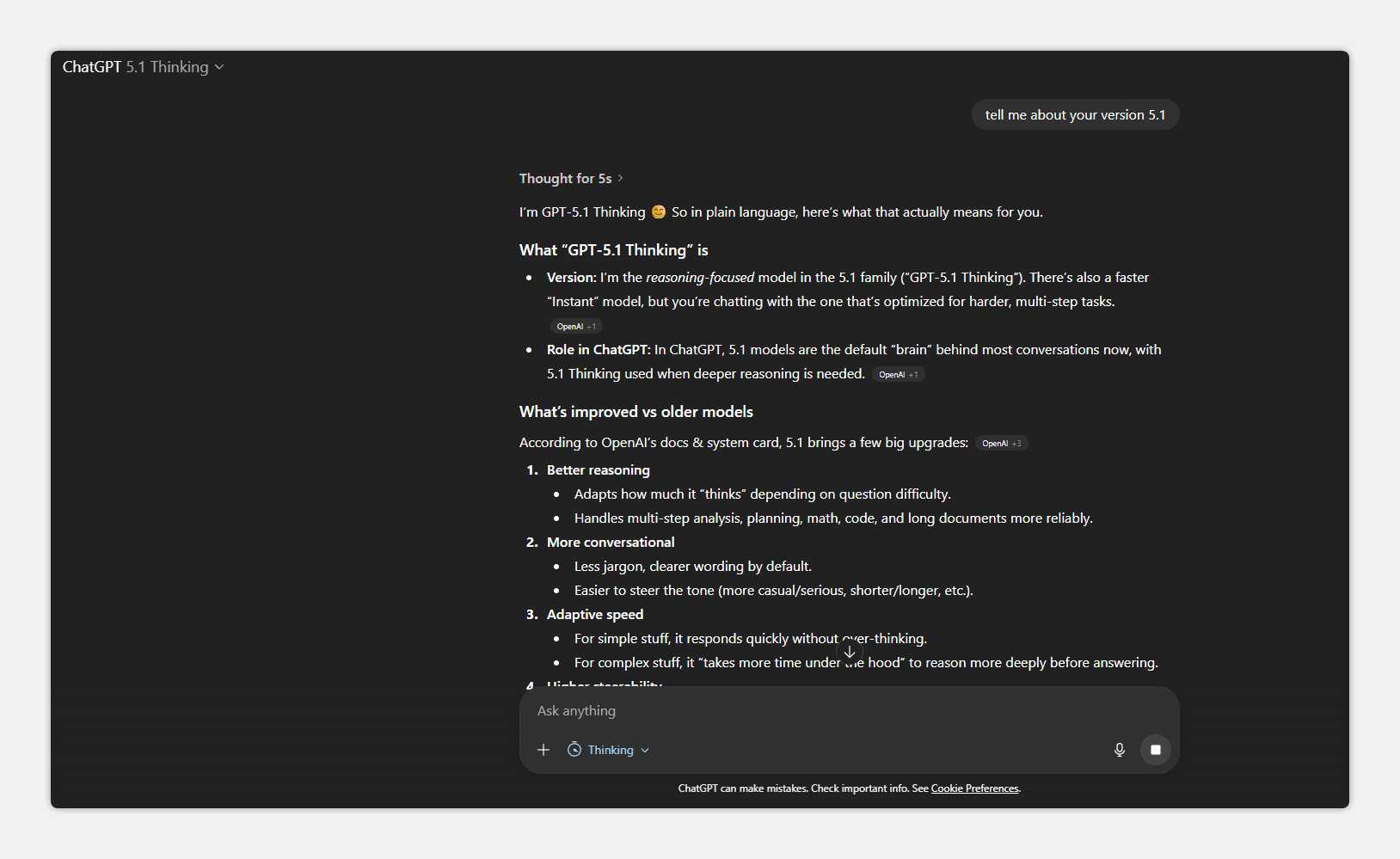GPT-5.1 is important step in ChatGPT evolution. OpenAI showed that advanced AI can be not just smart but pleasant to talk to. Combination of technical improvements (adaptive thinking, precise instruction following) and human tone makes GPT-5.1 best ChatGPT version today.