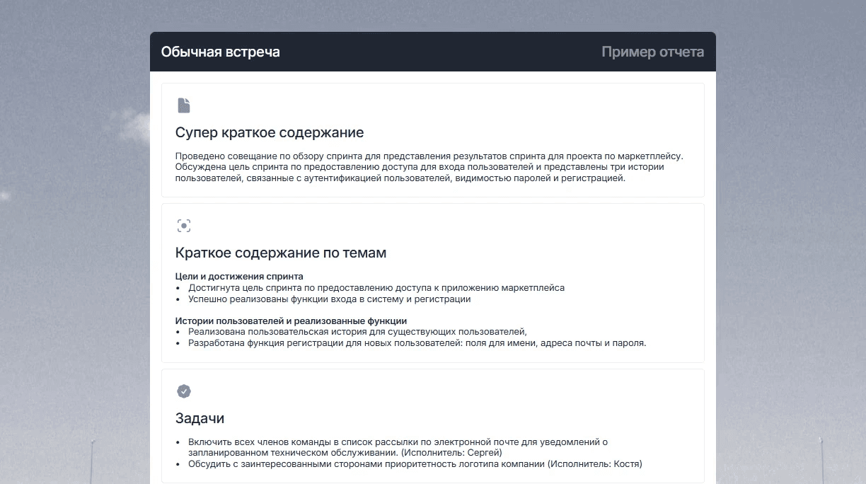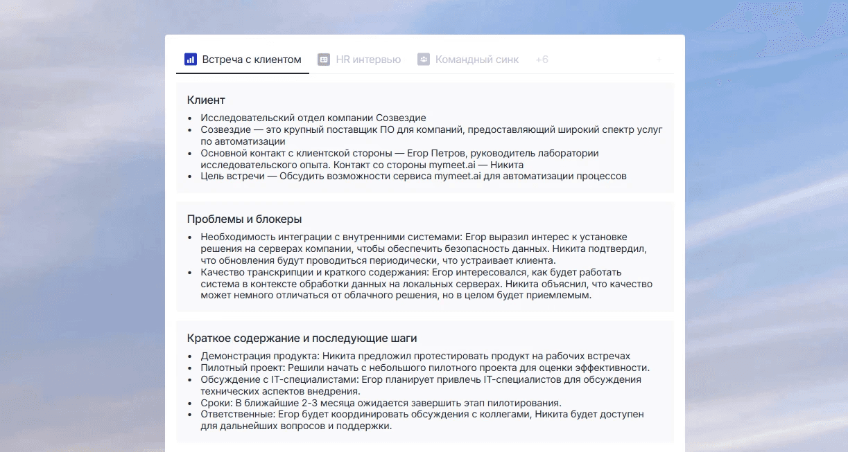 mymeet.ai автоматически записывает встречи с клиентами в Zoom, Google Meet, Microsoft Teams и Яндекс.Телемосте, расшифровывает речь с точностью 96-98% и формирует структурированные отчеты. Отчет «Встреча с клиентом» автоматически выделяет потребности, возражения и следующие шаги — именно те данные, которые нужны для понимания психологии покупателя.