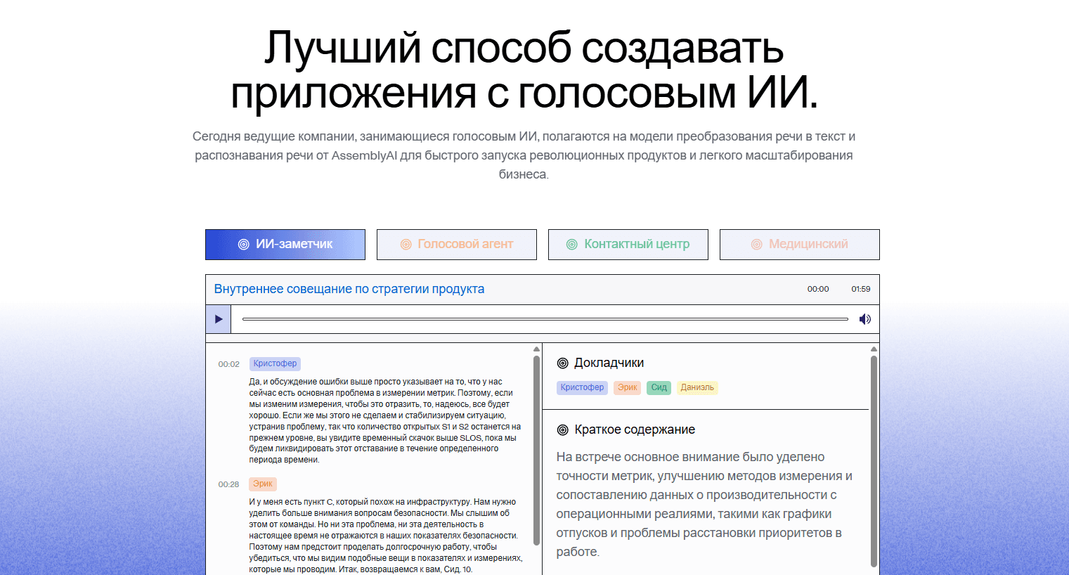 AssemblyAI подходит для компаний, которым нужен анализ встреч с клиентами при ИИ расшифровке текста.