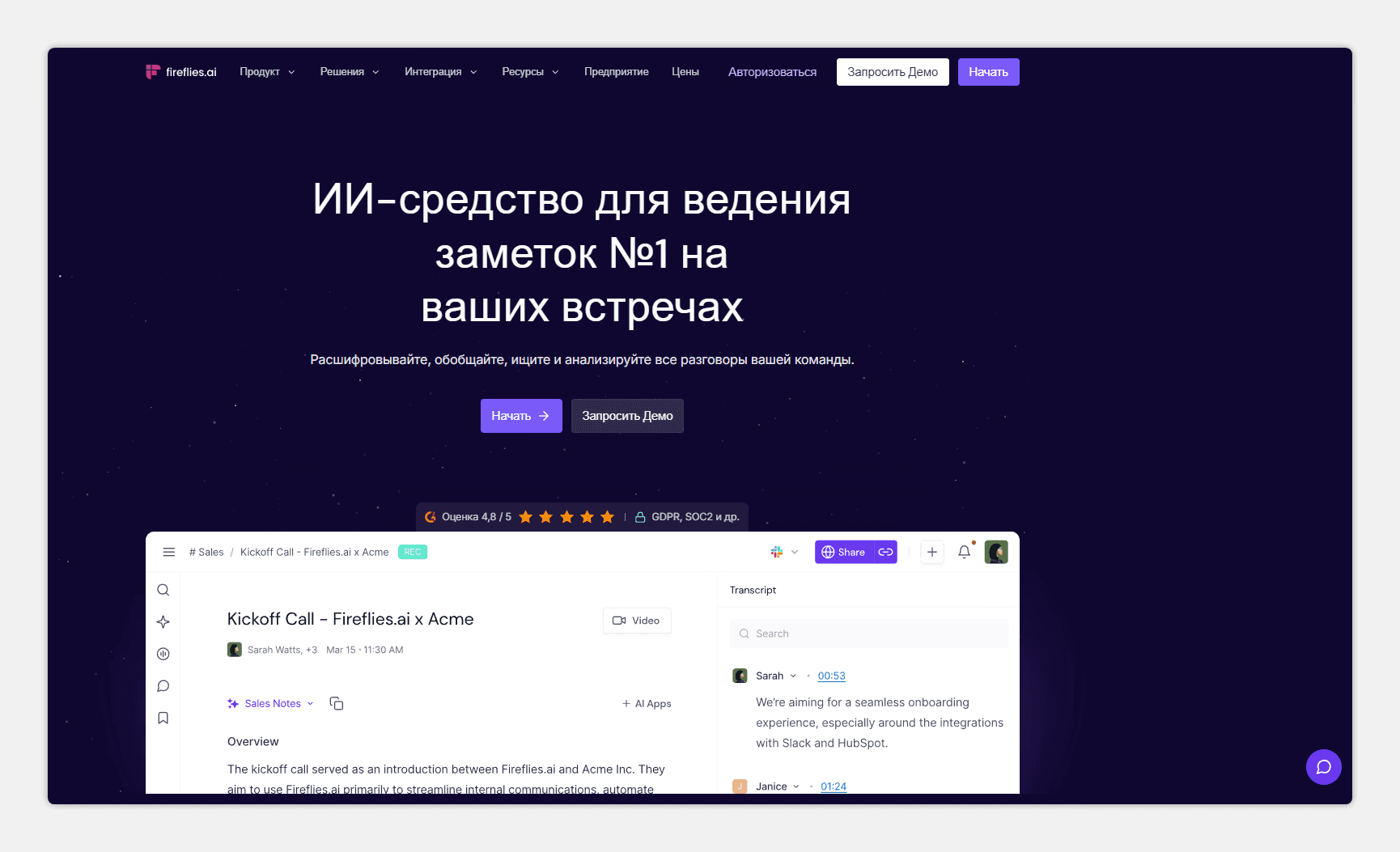 Fireflies.io | 90-92% | 4-6 минут | Анализ встреч + highlights |