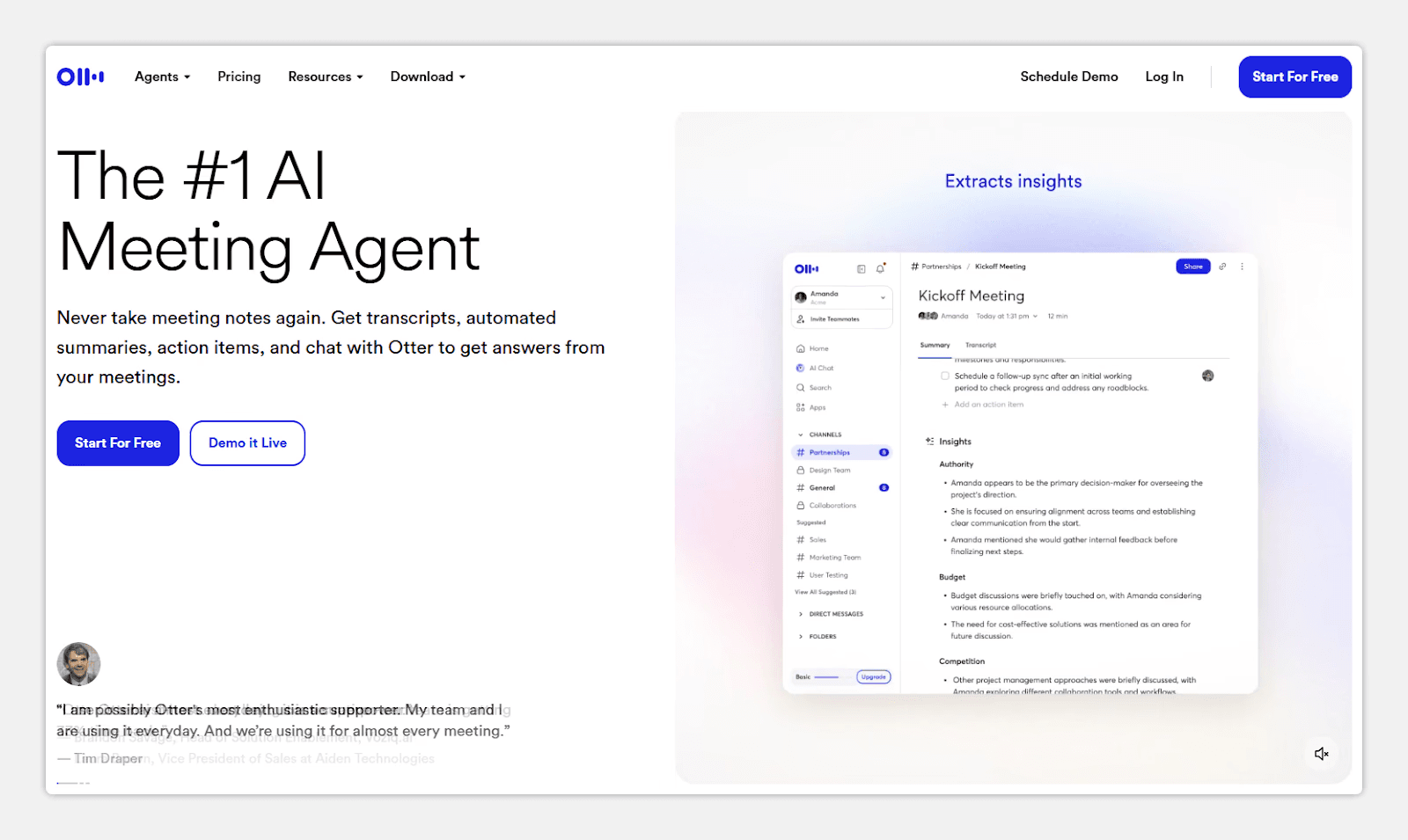Otter.ai создан для команд, которые проводят встречи в Zoom или Google Meet и хотят автоматической расшифровки аудио. Это отличный сервис для преобразования аудио в текст на английском языке. Ориентирован на англоязычные команды. С русским при преобразовании аудио в текст работает хуже — точность 80-85%, часто ошибается в специальной терминологии при расшифровке встреч.