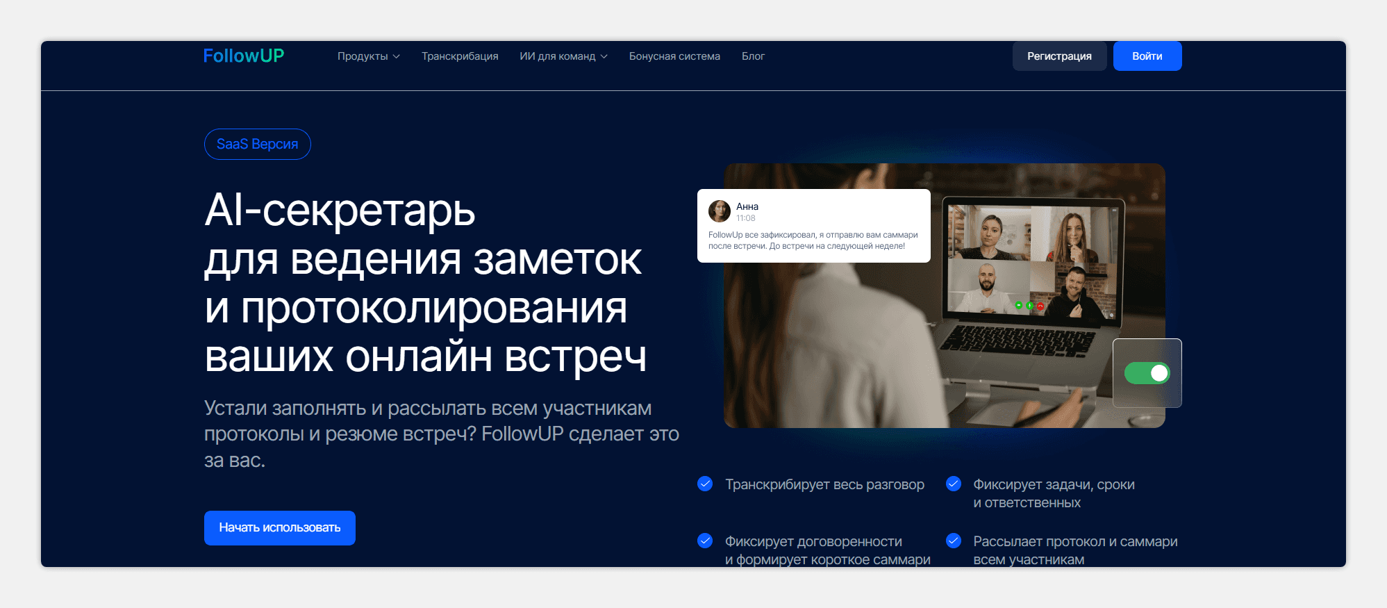 Follow-up идеален для корпоративных команд, которым нужна полная автоматизация документирования при расшифровке встреч.