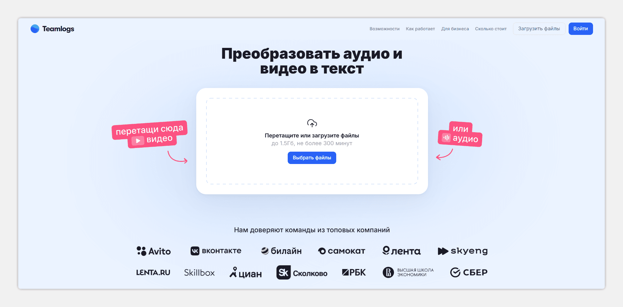 Teamlogs разработан в России и хорошо работает с русским языком при преобразовании аудио в текст. Это редкий случай, когда локальное решение конкурирует с западными сервисами по качеству расшифровки аудио. Сервис для извлечения текста из аудио специализируется на русской речи.