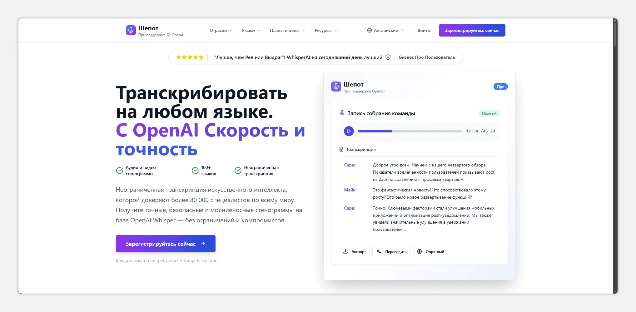 Часовое аудио обрабатывается за 2-3 минуты. Сервис популярен среди разработчиков, которым нужно встроить транскрибацию в собственный продукт. Для русского языка качество ниже, чем для английского, — это основной минус при работе с русскоязычным контентом.