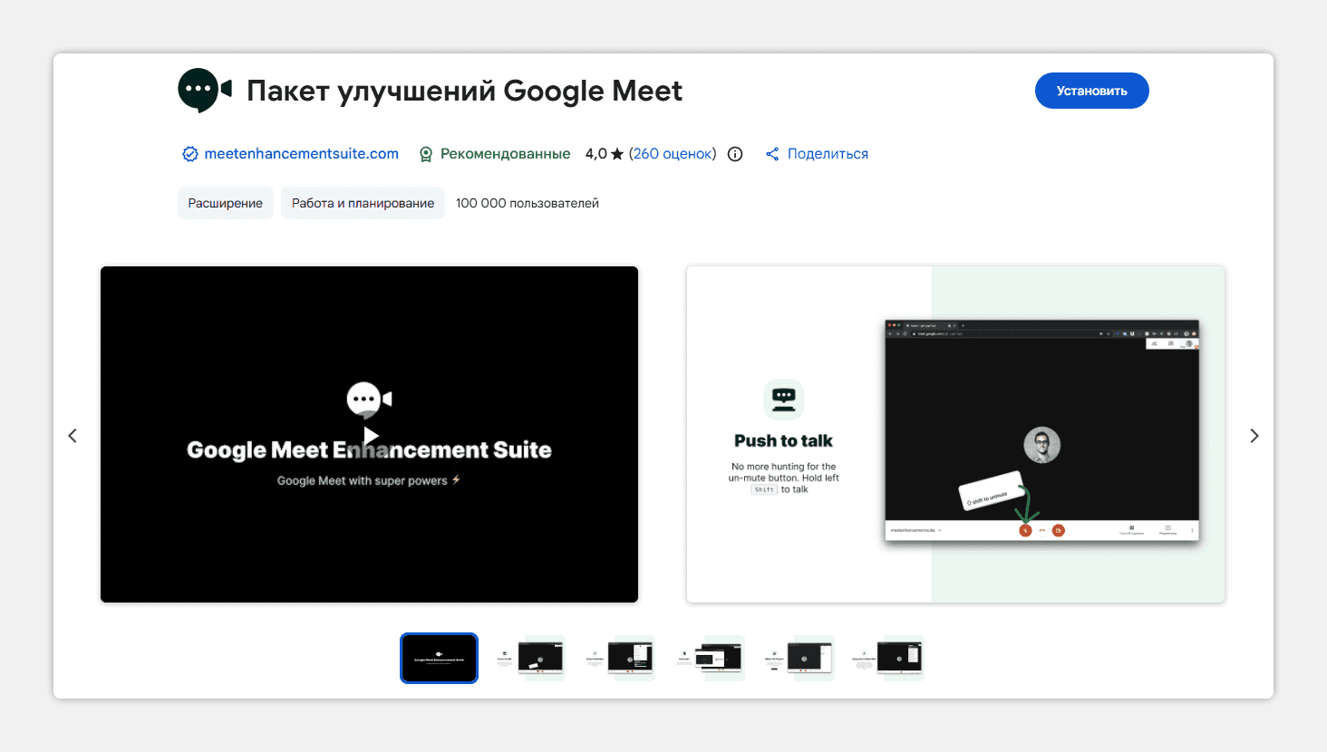 Кому подходит: всем пользователям Google Meet, которые хотят удобнее управлять микрофоном и камерой. Хорошо работает в связке с другими расширениями для записи.