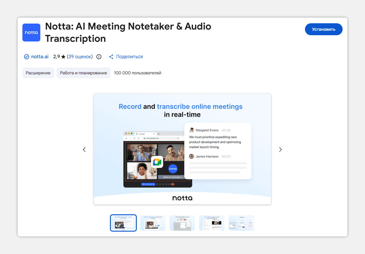 Расширение работает через интеграцию с Google Meet и не требует установки ботов. Транскрипция происходит в реальном времени, что удобно для ведения заметок по ходу встречи.