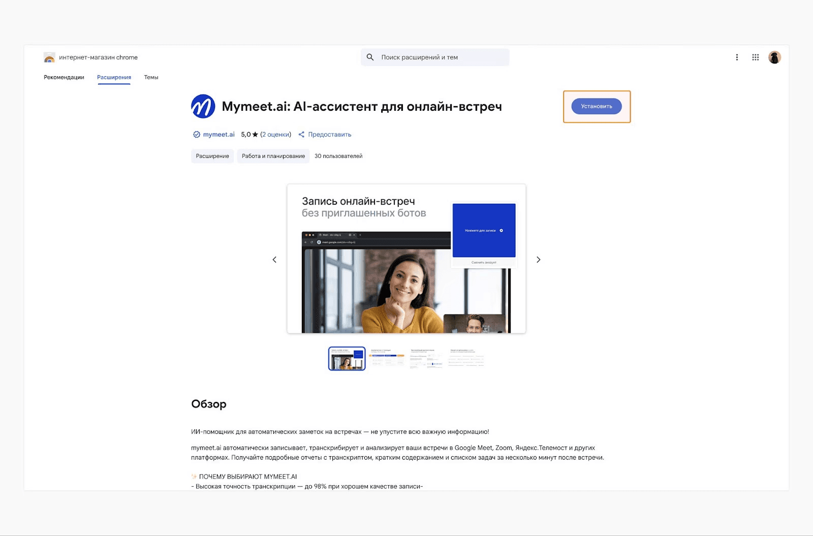 1. mymeet.ai — расширение для записи и анализа встреч в Google Meet