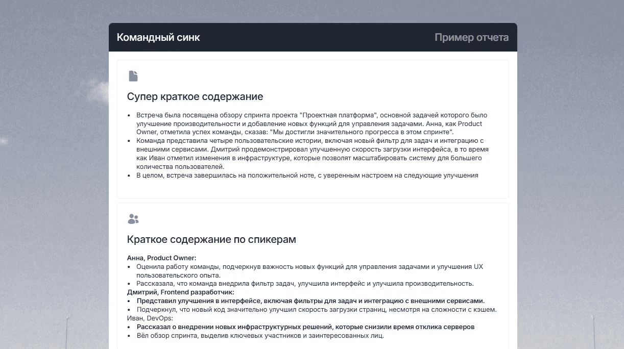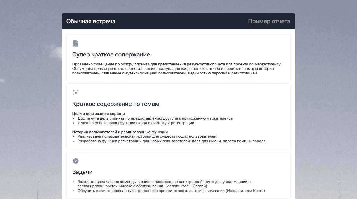Генерация саммари встречи за 60 секунд. AI выделяет ключевые темы, решения и договорённости, создавая структурированное резюме без необходимости ручной обработки.