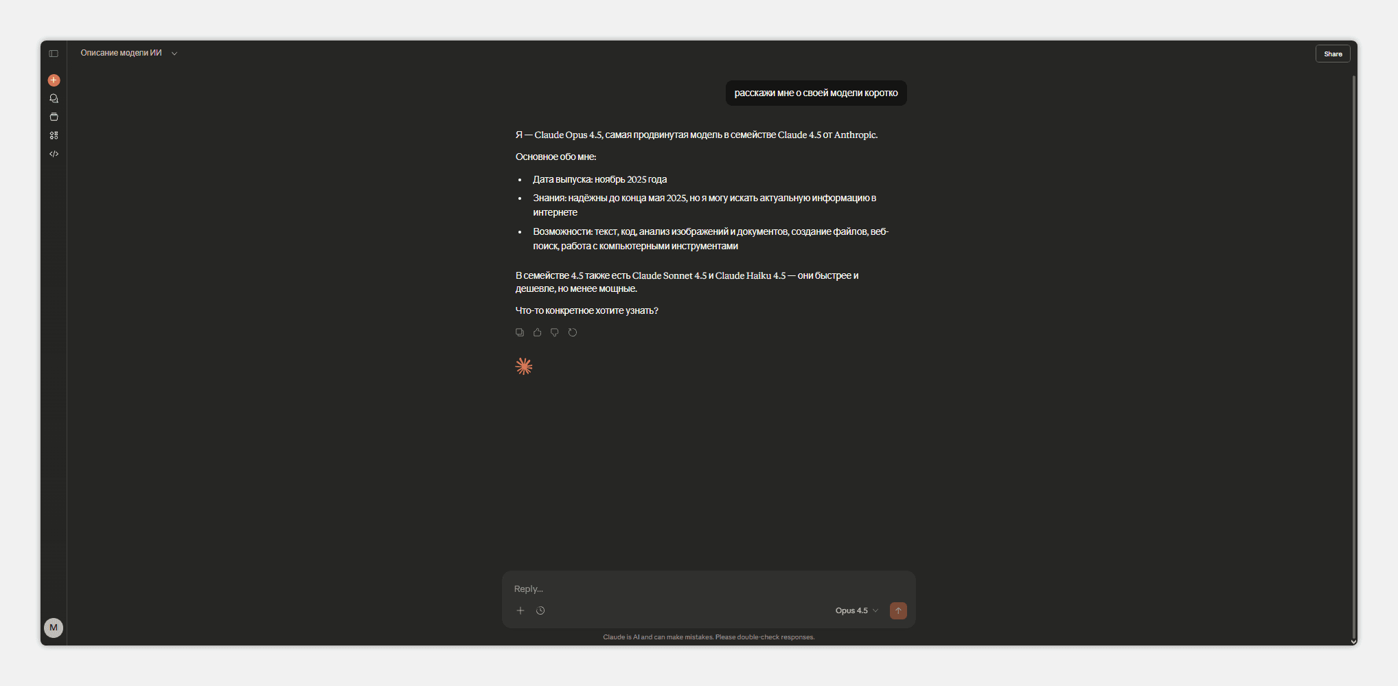24 ноября 2025 года компания Anthropic выпустила Claude Opus 4.5 — самую мощную модель в линейке Claude на сегодняшний день. По заявлениям разработчиков, это лучшая в мире модель для программирования, создания автономных агентов и управления компьютером.
