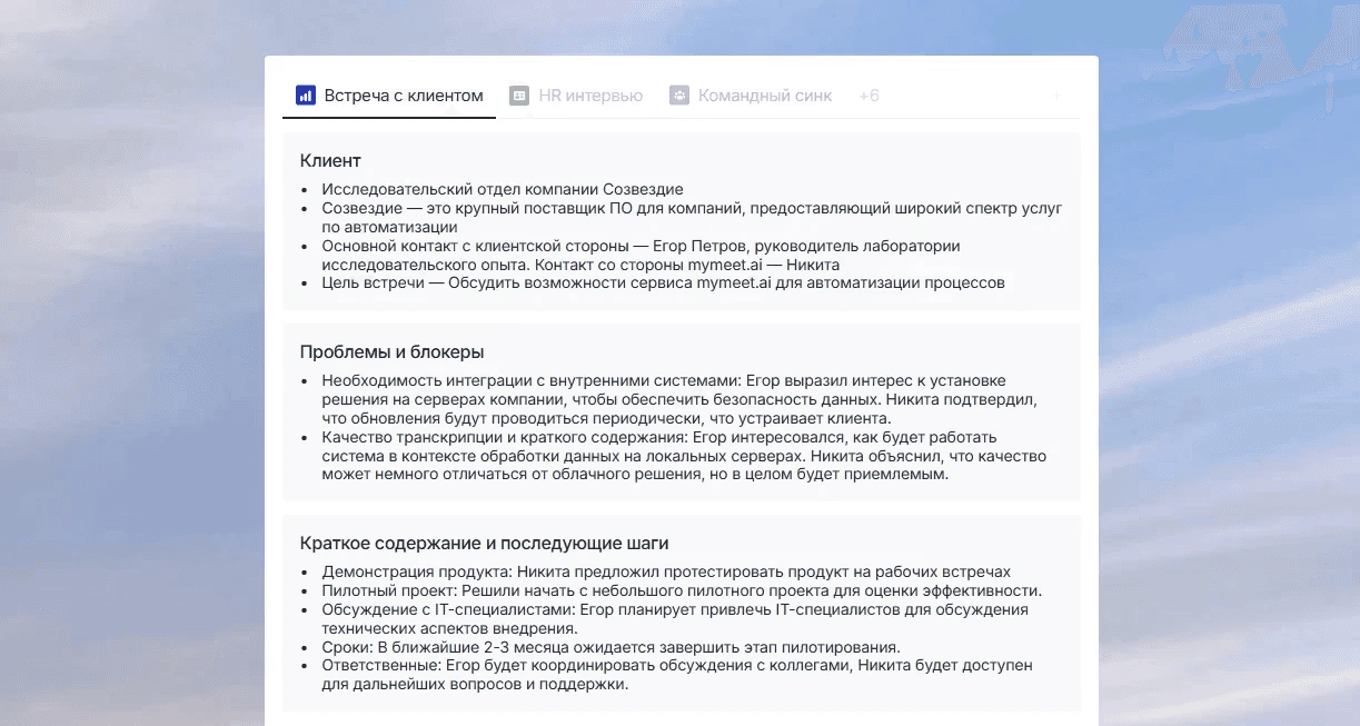 Интеграция с рабочими инструментами. Action items создаются в таск-менеджерах, решения сохраняются в Notion/Confluence, CRM автоматически обновляется.