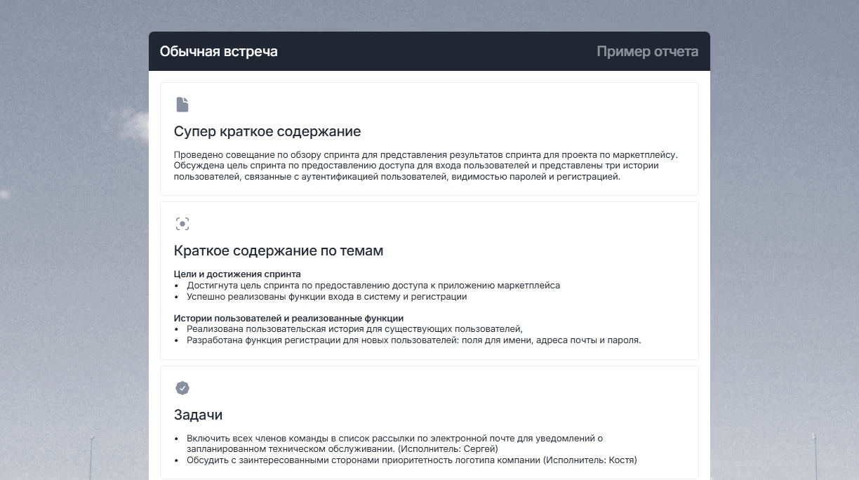 ✅ Готовый follow-up после встречи - резюме обсуждения с ключевыми моментами для отправки клиенту