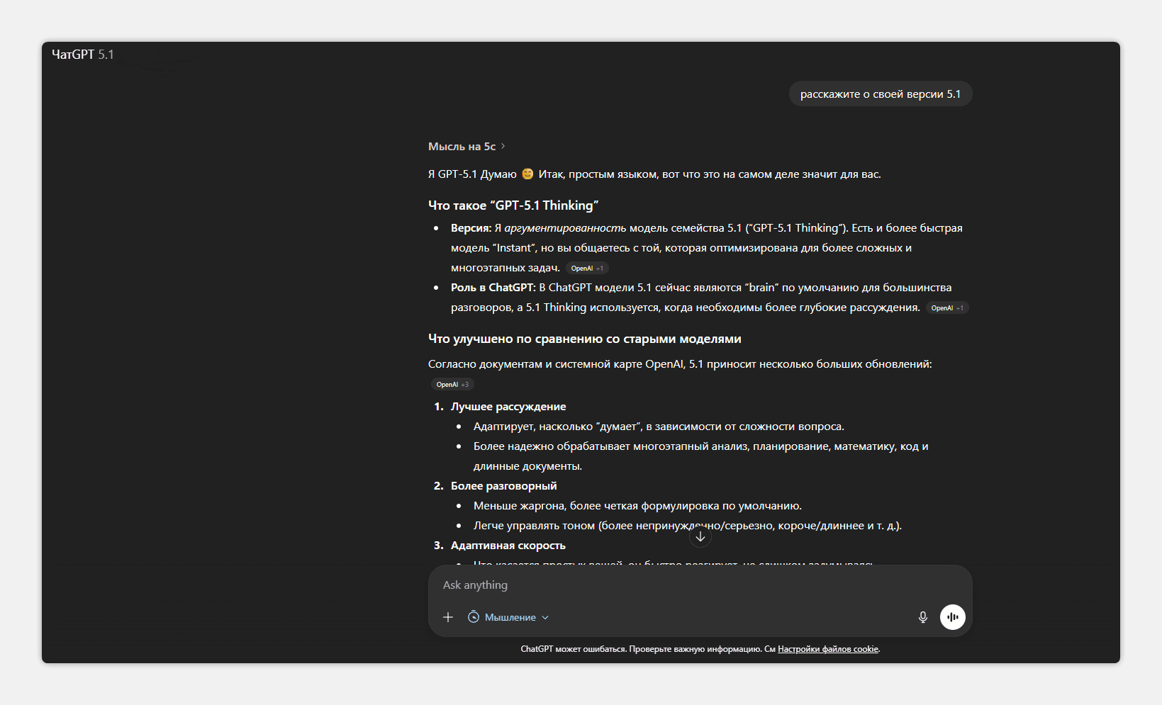 GPT-5.1 — это улучшенная версия GPT-5 с более теплым тоном, точным следованием инструкциям и адаптивным мышлением. Это не новое поколение, а значительный апгрейд в рамках семейства GPT-5.
