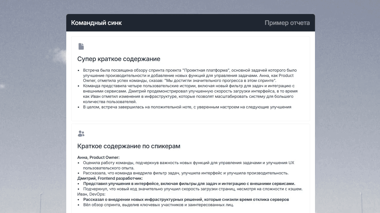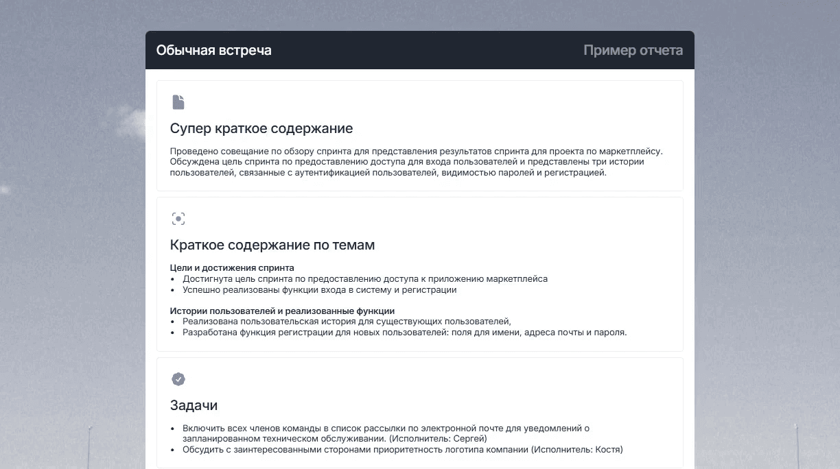 ✅ AI-отчеты — создает структурированные итоги с решениями, задачами и следующими шагами