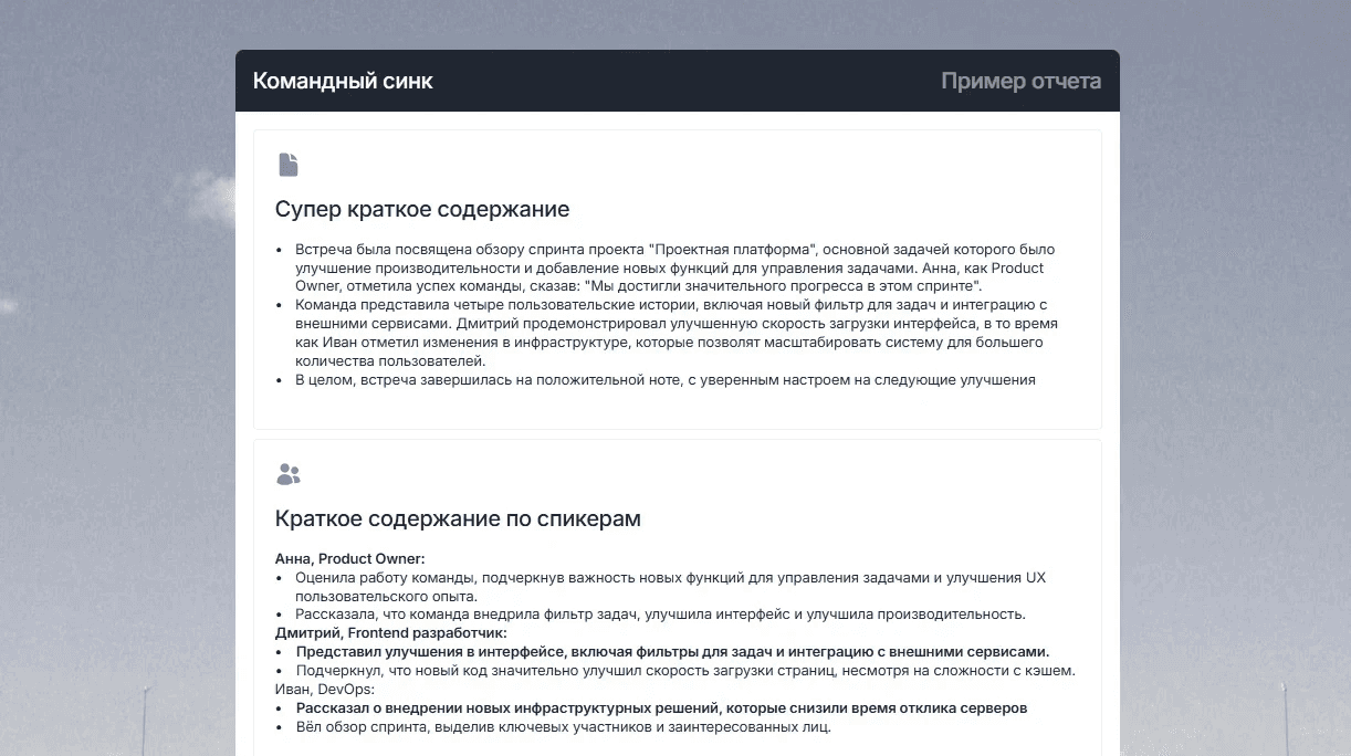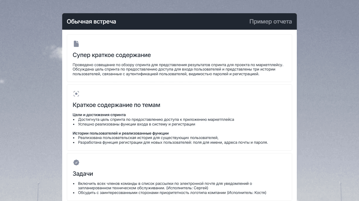 Внедрение mymeet.ai изменило ситуацию. Каждая встреча автоматически фиксировалась. Система извлекала ключевую информацию - проекты человека, вызовы, договоренности. Напоминала о follow-up.