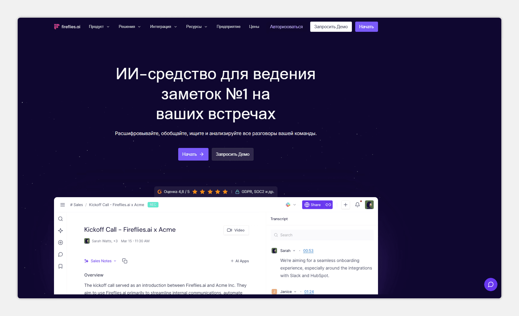 Fireflies подходит для продажных команд, которым нужна аналитика видео встреч при переводе в текст.